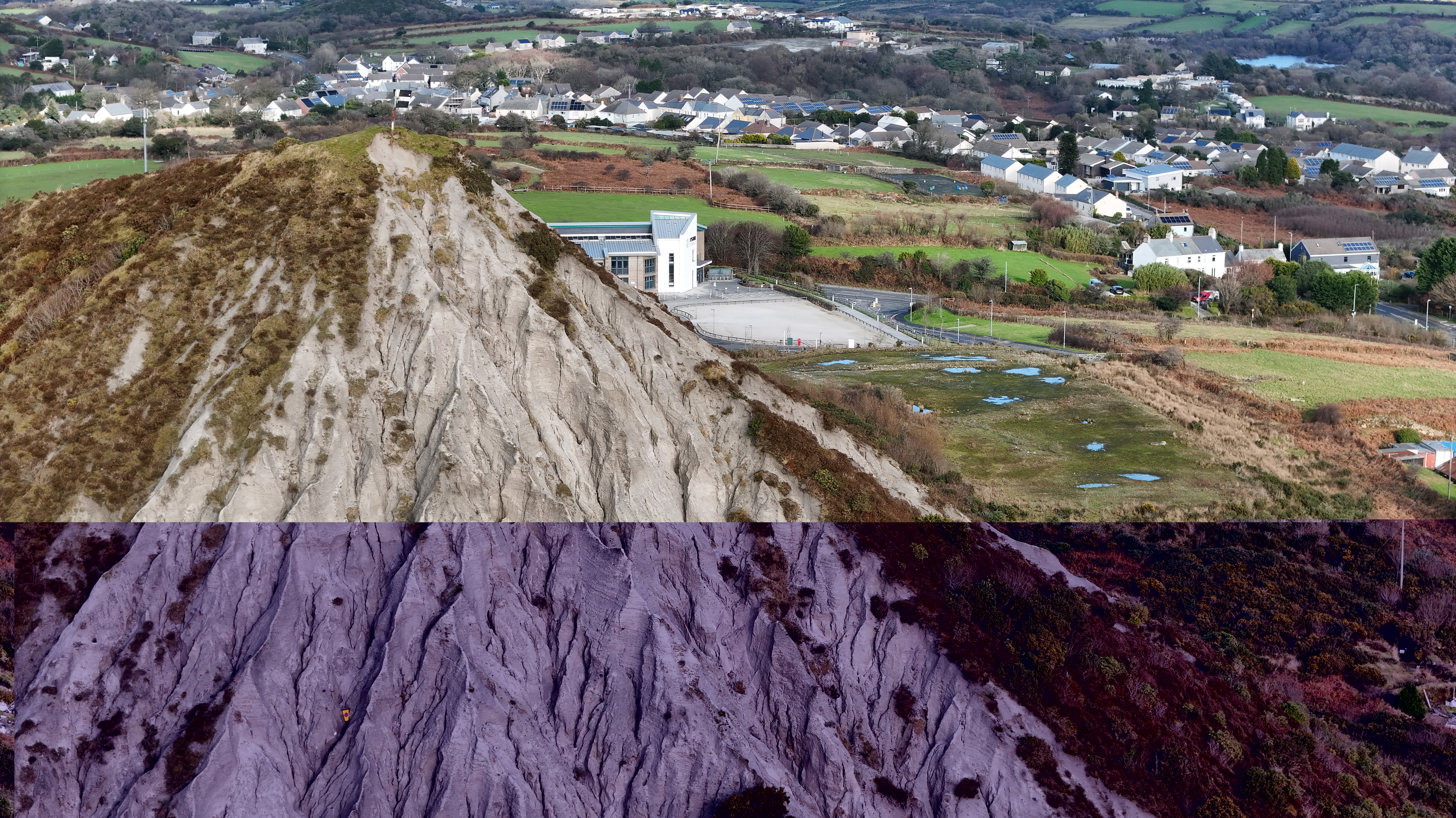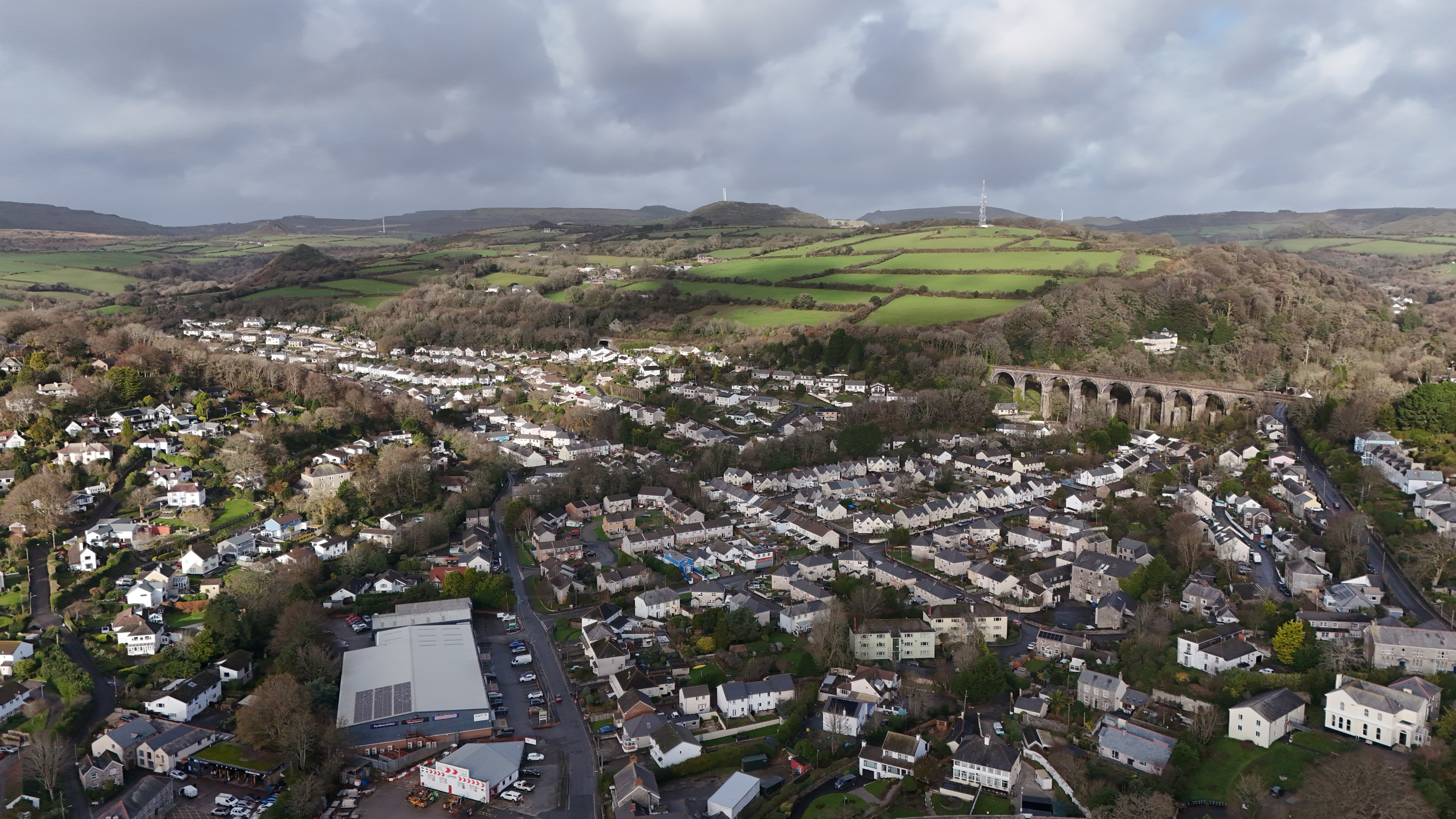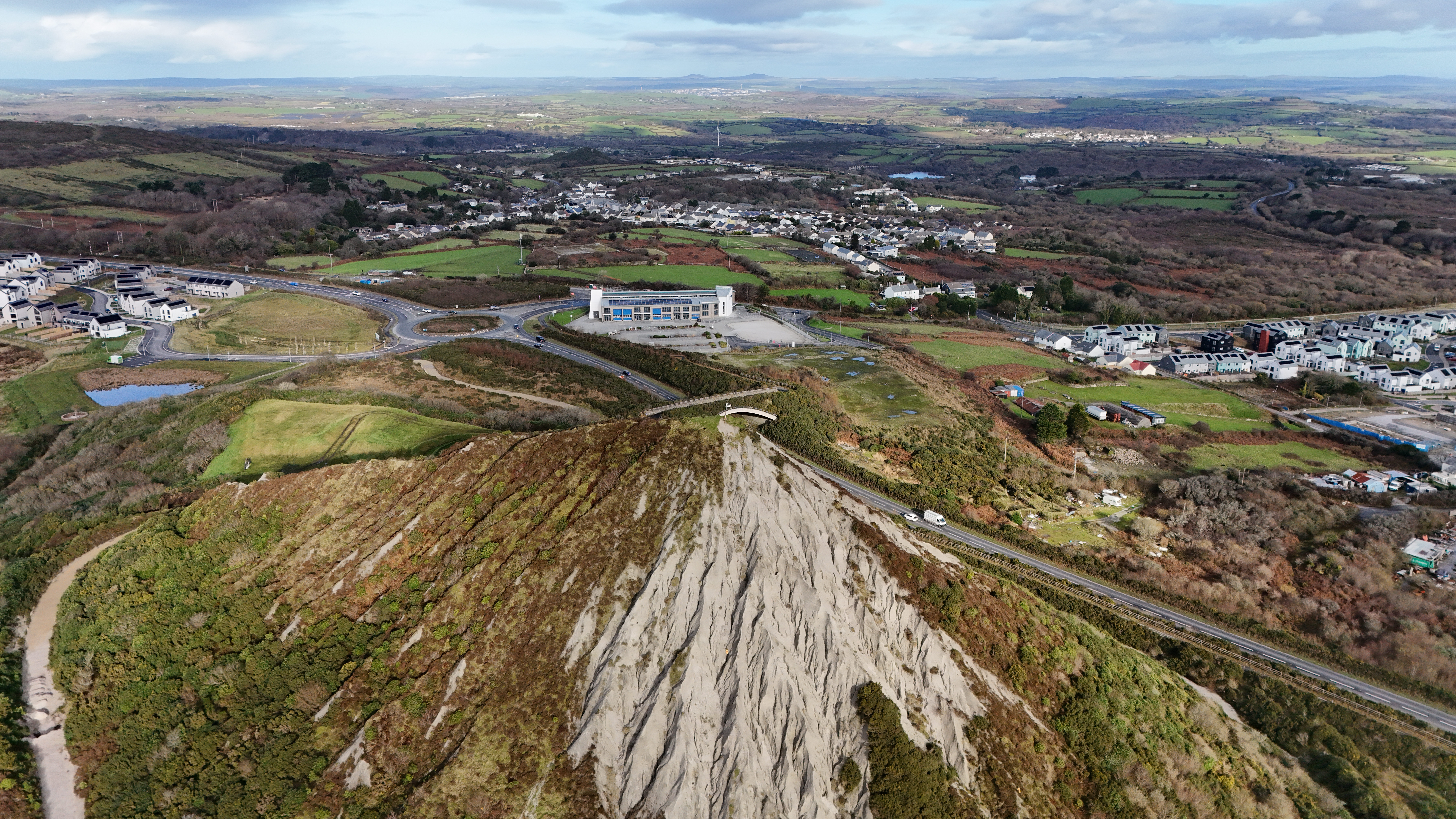 The Carluddon Sky Tip is the undisputed landmark of this region. Often called "The Cornish Alps," this towering conical peak is a monument to the generations who worked the local china clay pits. From the air, its sharp geometry provides a perfect focal point against the surrounding moorland.