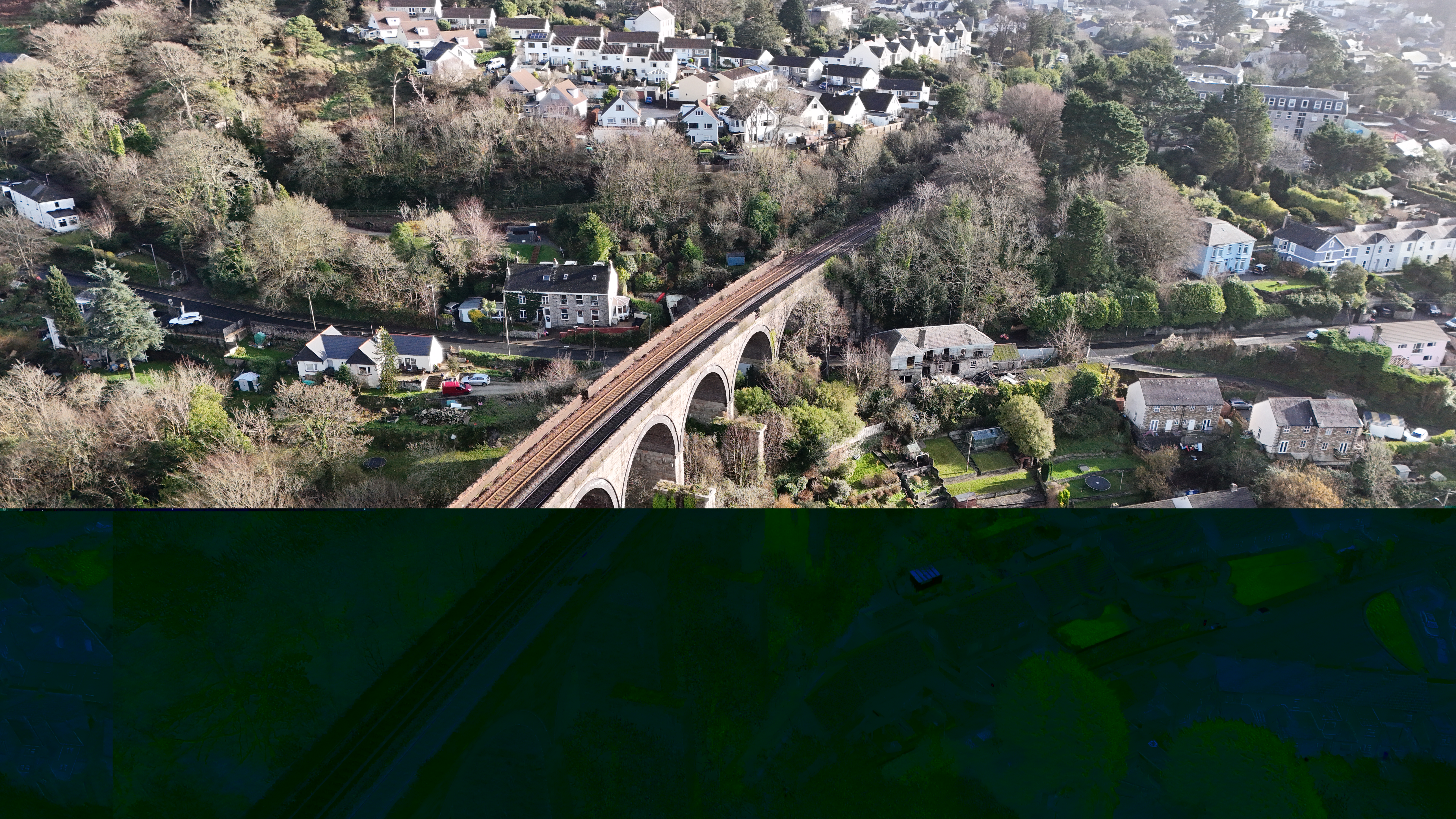 The Gover Viaduct is quite literally our backyard. We find ourselves drawn to filming here constantly; there is something uniquely convenient and captivating about being able to take off from our garden and immediately capture the sheer scale of the viaduct set against the stunning, rolling scenery of the valley.